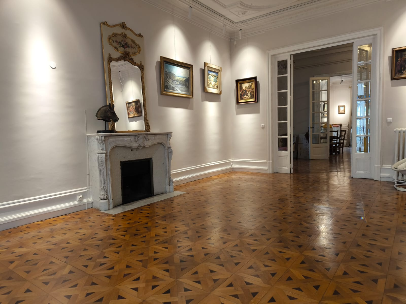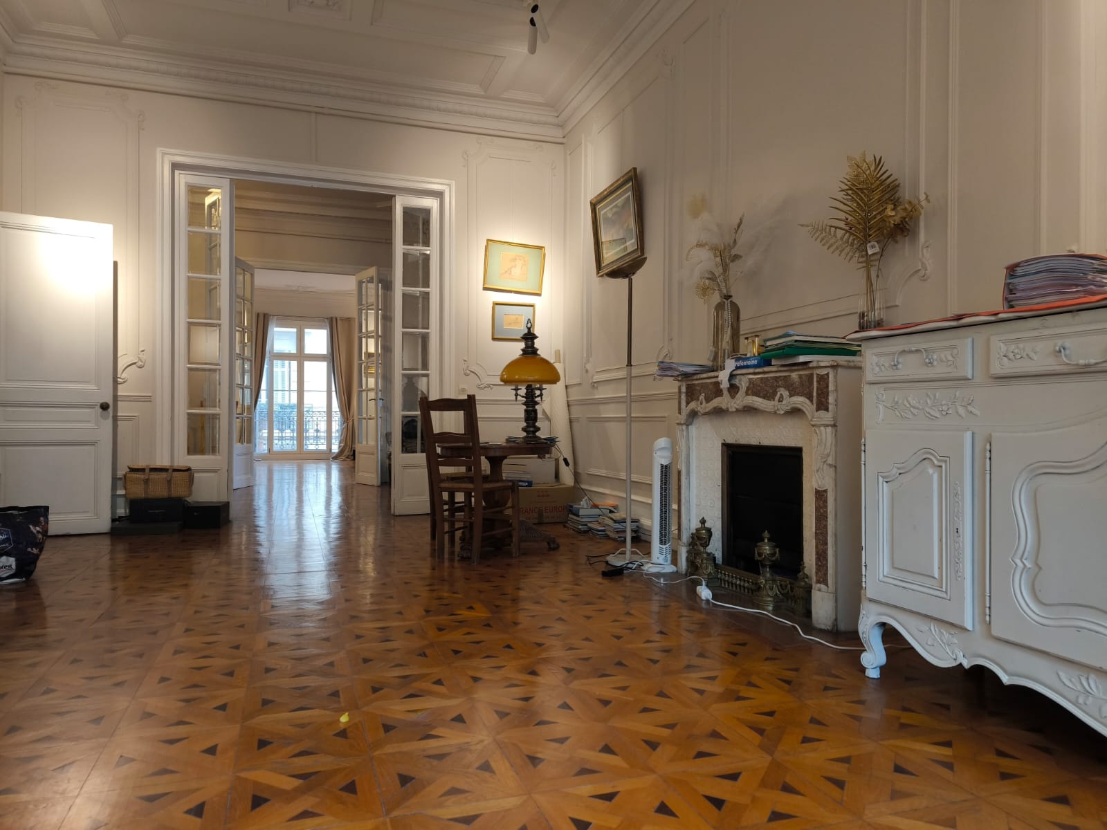 L’appartement, traversant et baigné de lumière, s’articule autour d’une pièce de réception magistrale d’environ 110 m², idéale pour recevoir dans un cadre raffiné. Les hauts plafonds, les moulures d’époque, le parquet en point de Hongrie et les cheminées en marbre confèrent à ce lieu un caractère unique.