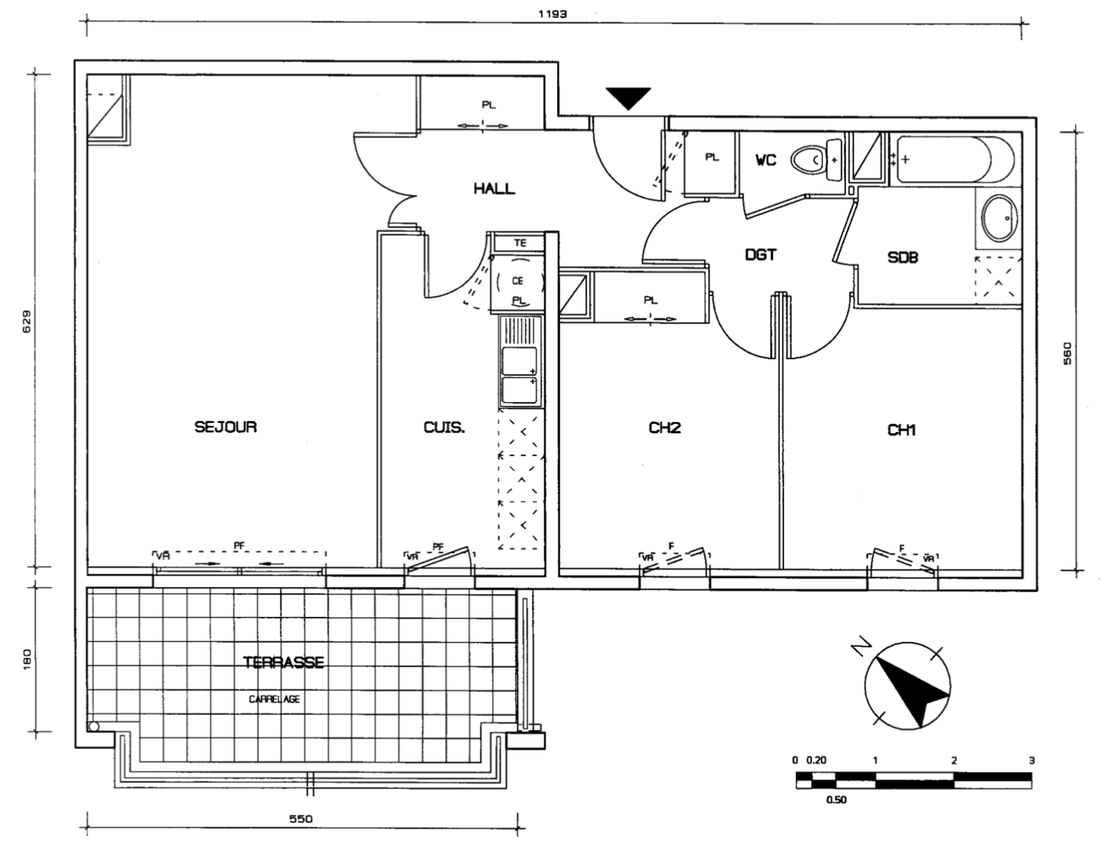 - à droite, un salon séjour de 24 m² et une cuisine séparée et aménagée, les deux pièces donnant sur la terrasse de 14 m²