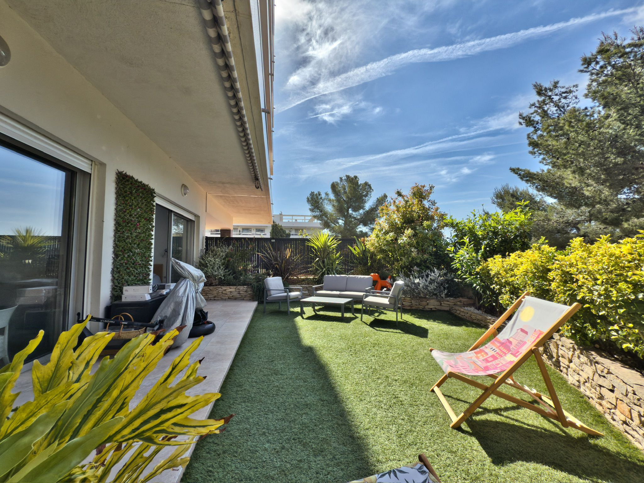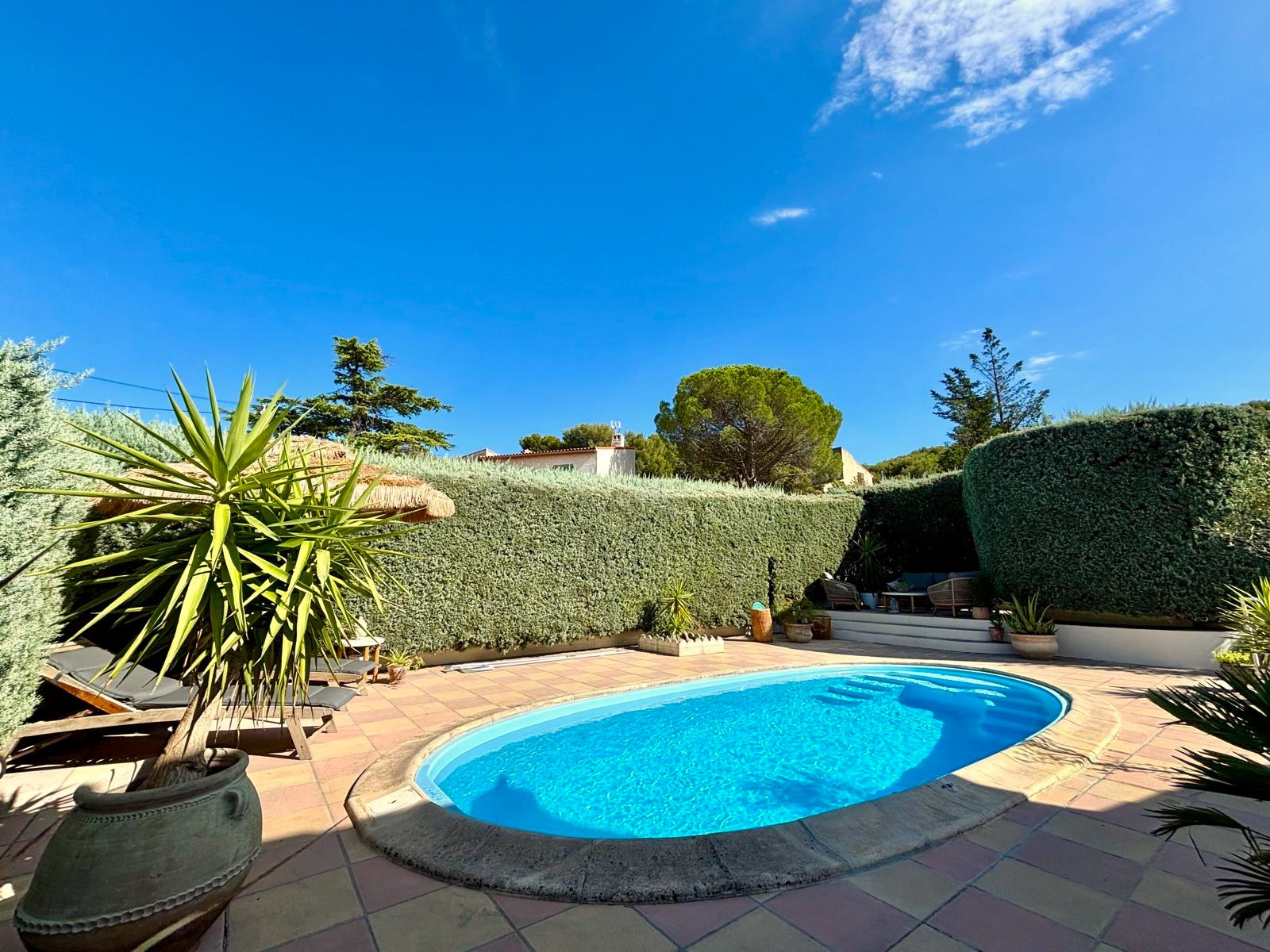 A l'exterieur, l'espace est dédié à la convivialité avec piscine, une terrasse au SUD et une autre orientée NORD pour les fortes chaleurs, Barbecue, SDE et WC.